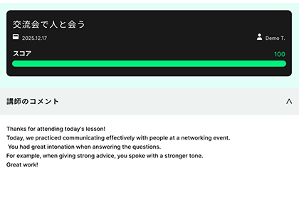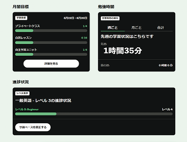 Self-studyの学習状況や、レッスン、グループ受講回数が確認できます。学びのペースを整え、モチベーションの維持にもつながります。